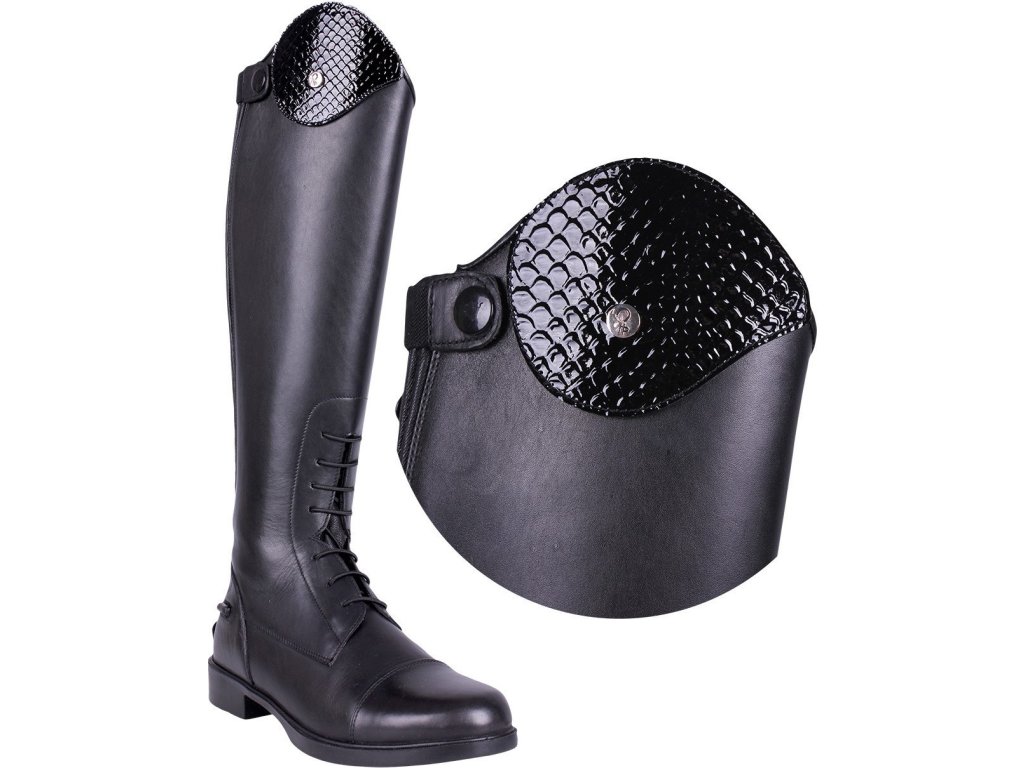 Wymienne części do wysokich butów jeździeckich Romy marki QHP. Wykonane ze skóry lakierowanej ze wzorem skóry krokodyla. Można je łatwo przymocować za pomocą rzepu. Dostarczane w parach.