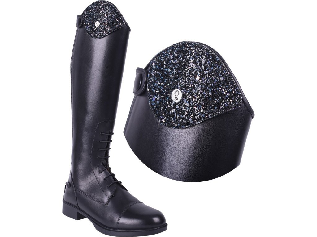 Wymienne części do wysokich butów jeździeckich Romy firmy QHP. Ozdobione brokatem, aby but lśnił stylowo. Można je zapiąć na rzep. Dostarczane w parach.