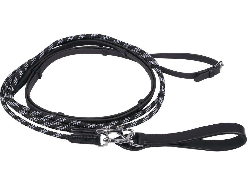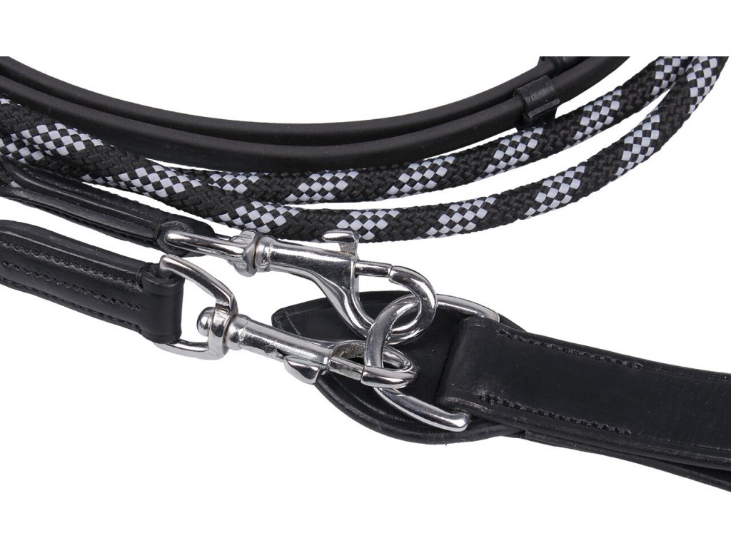 Wypinacze z Biothane, które są nie tylko trwałe i mocne, ale także bardzo elastyczne. Wypinacze służą jako wodze pomocnicze, sprowadzając głowę konia do niższej pozycji i biegną od popręgu przez kółka wędzidła do potylicy. Odpowiednie do lonżowania. Dostępny również w kolorze brązowym. Rozmiar FULL.