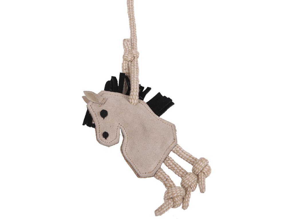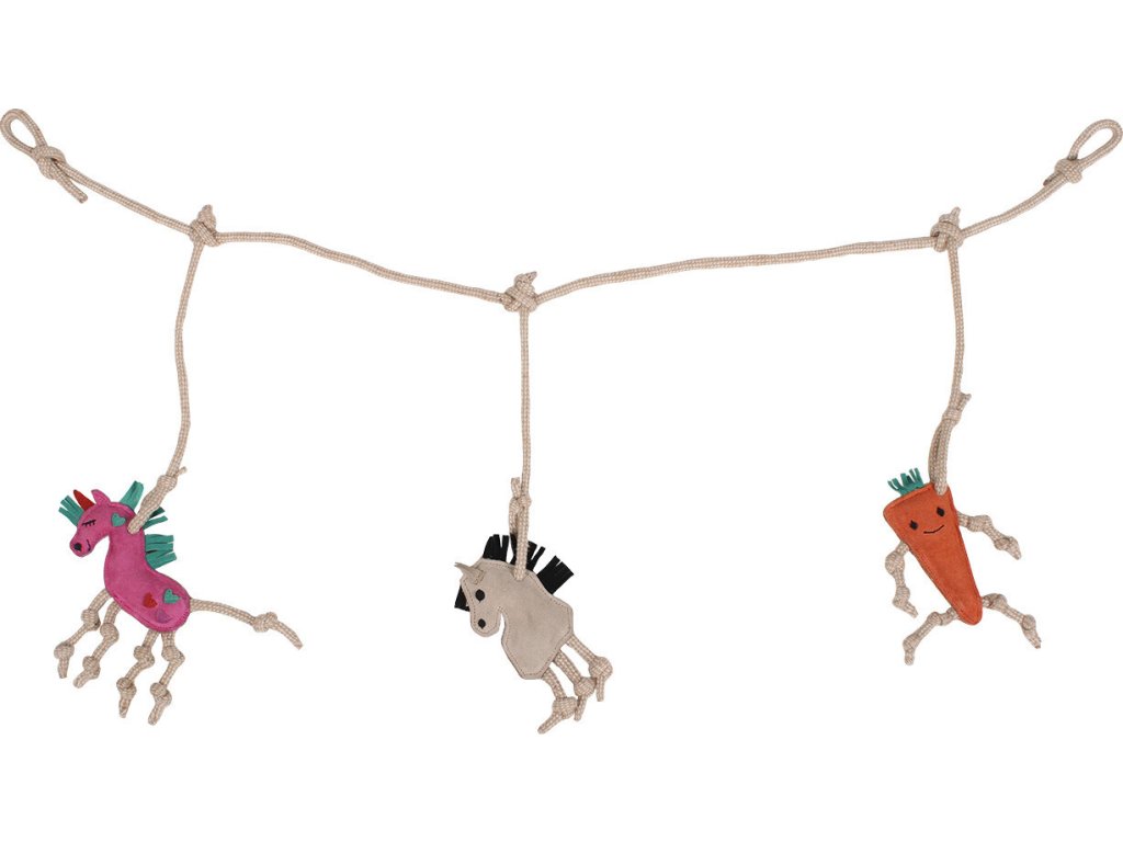 Wysokiej jakości zabawka dla koni, która zapobiega nudzie w stajni. Zabawkę można łatwo zawiesić na bawełnianym sznurze. Długość wynosi 120 cm, a wysokość wiszących zabawek to 10-14 cm. Wykonana jest z bardzo trwałego materiału, który jest całkowicie bezpieczny dla koni.