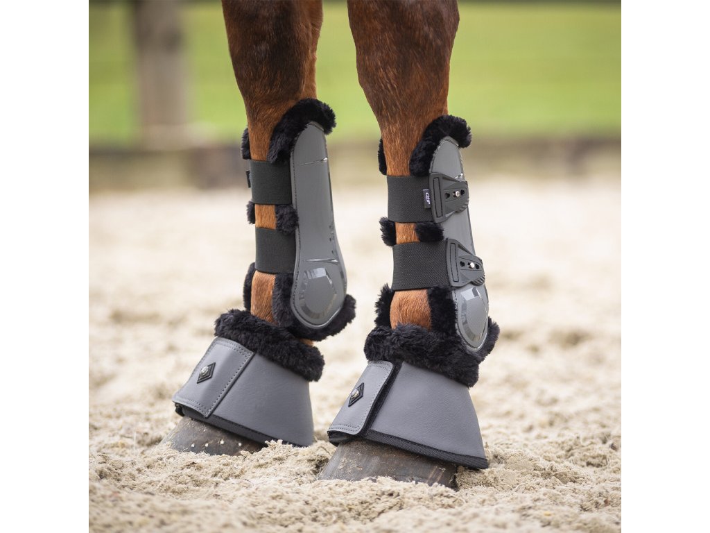 Wytrzymałe kalosze dzwonkowe z oddychającą neoprenową wyściółką i sztucznym futrem owczym. Neoprenowa wyściółka jest oddychająca, doskonale amortyzuje wstrząsy i chroni konia przed urazami. Miękka, syntetyczna skóra jagnięca wokół obwodu zwiększa komfort noszenia i minimalizuje ryzyko otarć, dzięki czemu szczególnie nadaje się dla wrażliwych koni. Ochraniacze dzwonkowe są wyposażone w łatwe zapięcie na rzep.Podana cena dotyczy pary.